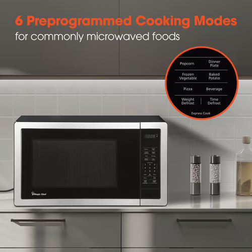 The Magic Chef 0.9-cu. ft. countertop microwave is designed to perform all your heating and cooking needs in 1 compact piece of equipment that will fit into any kitchen, dorm room, or office environment. This device has 11 power levels to accommodate different heating needs. The digital display is easy to read, and the handy kitchen timer is a must-have for any cook in the kitchen. It features user-friendly controls, including express-cook buttons and auto defrost options for weight and time. There are 6 auto-cook menus for commonly microwaved items and including popcorn, dinner plate, pizza, baked potato, beverage, and frozen vegetables. This Magic Chef microwave is also designed to have an “add 30 seconds” button. As a safety measure, it has a child safety lock to avoid unintended use of the microwave. This microwave comes with a 1-year parts and labor warranty and a 5-year compressor part warranty. With the Magic Chef microwave oven, you can spend less time cooking and more time focusing on other important tasks, without compromising on the quality of your meals. This indispensable appliance adds both functionality and convenience to your kitchen, making it a must-have for any modern home.