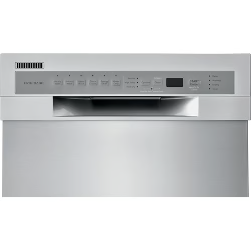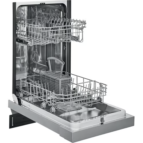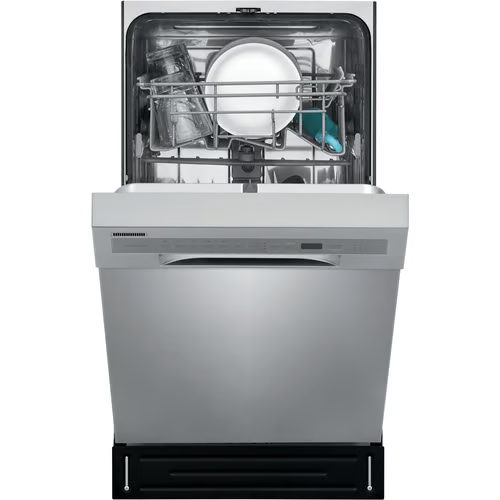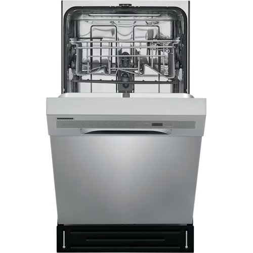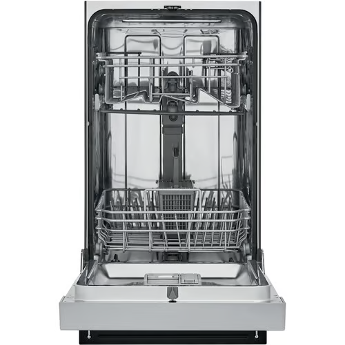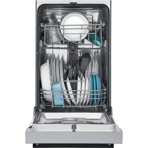 The Frigidaire 18” Built-In Dishwasher in Stainless Steel has a top and bottom rack dual spray arm system that gives you a thorough clean every time. National Sanitation Foundation certified, it’s sanitize cycle removes 99.9% of common household bacteria. This dishwasher cleans 8 place settings in one cycle and features easy-to-use cleaning cycle options for your different cleaning needs, including Energy Saver, Heavy Wash, and Rinse Only.